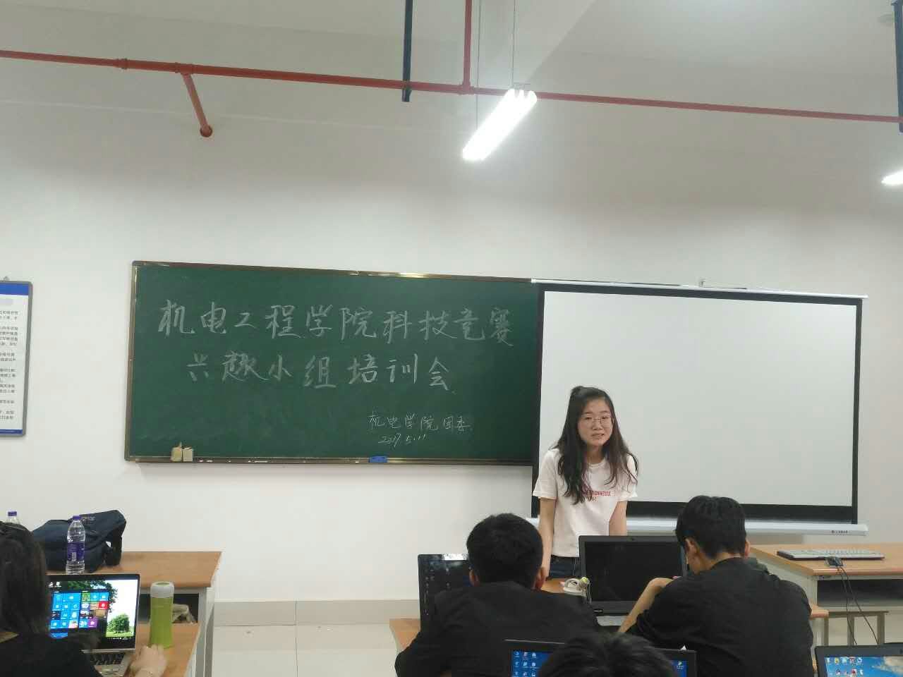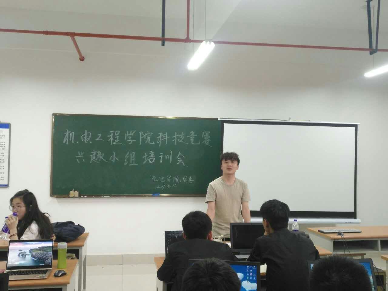为培养机电工程学院2015、2016级同学们参与科技竞赛的热情,提高同学们参加比赛的技能,5月11日晚,在草堂校区工程训练中心409教室进行AE和绘声绘影软件视频制作培训会暨科技竞赛经验交流会,本次交流会邀请了电气1304班朱一帆学长、电气1302班蒙双伟学长、陈晓宇学姐,参加此次培训活动的还有机电工程学院机械基础实验中心闫浩老师、2016级辅导员王亮亮老师。