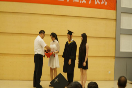 随后,学院党委书记王继武向优秀毕业生代表赠送毕业戒指并致辞,王书记指出,毕业戒指不仅是对大学生活的纪念,更是开启未来生活的信念,学院永远是每一名毕业生坚强的后盾和港湾。最后,王书记借用王蒙先生的诗句表达了他此刻的心境:“让我永远想念你们,招呼你们,并且怀着骄傲,注视着你们。世间一切都是遇见,就像冷遇见暖,就有了雨;春遇见冬,有了岁月;天遇见地,有了永恒;人遇见人,有了生命。从遇见到陪伴,从陪伴到成长,2013级的每位同学都深深的印在了我的脑海里,我满怀骄傲,深情的注视着你们,我满怀骄傲,深情的憧憬着你们,如我的孩子,即将展翅翱翔天空的孩子。请笑我多情,这世上有一种多情、有一种想念,它们都叫悲白发。”王书记满怀深情的讲话深深的触动着在座的每一位毕业生。