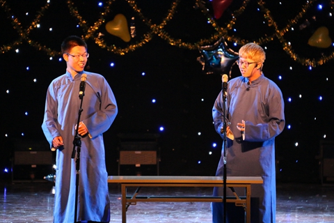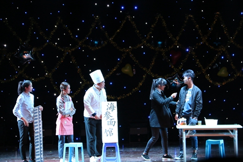 之后为大家呈现的小品《吃面》更是魅力四射,演员们用滑稽搞怪的神情、灵动活现的肢体语言使同学们爆笑不断,将现场气氛推入新的高潮,快来给他们比心心吧~