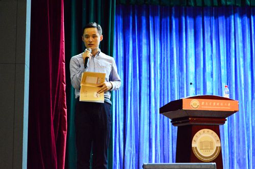 大会开始后,由张皓老师给学院2017级新生发言。首先他对新生们的到来表示热烈的欢迎和真诚的感谢。随后他通过图文形式从人数、生源地等方面解析了2017级新生结构。进而希望每位新生都能在大学找到真正的自己,从各个方面进行发展。接着,张老师为新生解析了我校校风校训及我院院风院训。从字面意思到实践生活中,校风校训、院风院训都能让学子恪守自己心中的红线,从而做一名优秀的机电人,建大人。然后张老师宣读了安全纪律条例。他列举了学院许多处罚条例并告诫新生们严格遵守学院纪律,不能触碰禁区。此外,张老师也为新生们将来的学习生活方面提出了宝贵建议。他建议新生们明确完整的学习规划,让自己有目标、有理想的度过大学生活,避免迷失方向,碌碌无为。他鼓励新生们坚持早读早锻炼和晚自习制度,进而强健自己的体魄,充实自己的内心。他也建议新生们在课余时间积极参加班委、学生会以及各种社团组织。通过这些活动能让新生们汲取到很多书本里学不到的知识和技能进而发掘自己的潜力。他说,“在遇见你们后,你在奔跑吧,阳光撒的恰好。你笑着的脸,就像微风吹过刚开的花朵。我想我看到了最美的景色。”