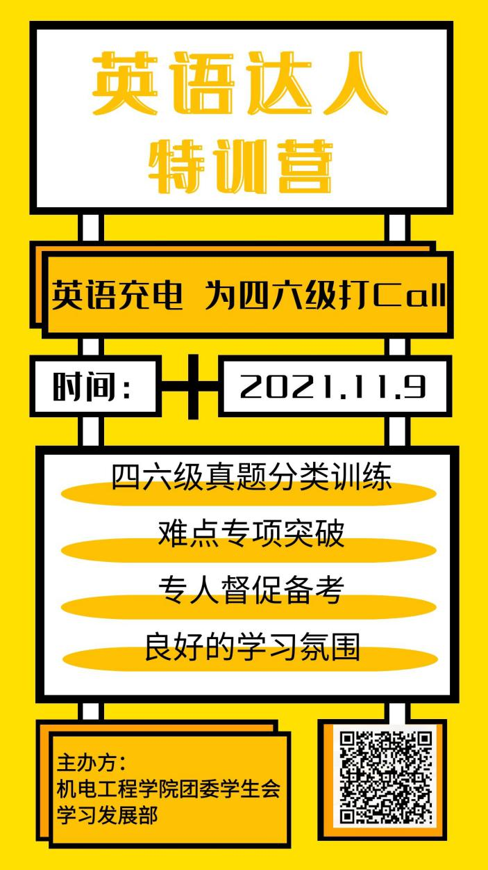 那么现在不⽤担⼼,因为“ 它”来了。为加强学院学⻛建设提⾼四六级通过率,学习发展部决定举办英语达⼈特训营活动。