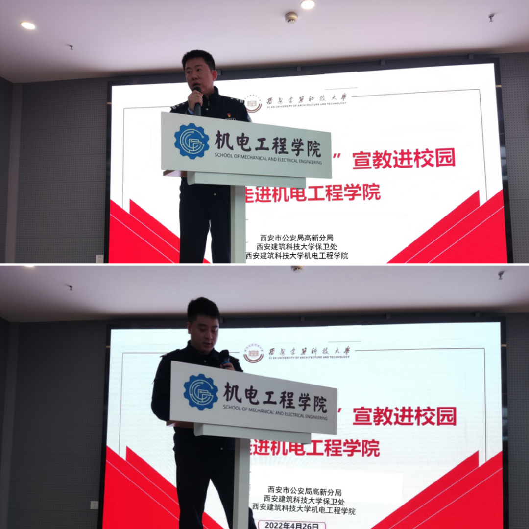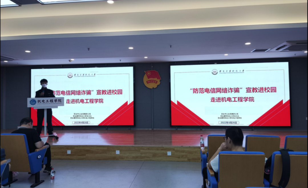 为提高师生电信网络诈骗防范意识,保护师生财产安全和合法权益,4月26日,机电工程学院于机电楼615报告厅开展“防范电信网络诈骗”宣传教育会。学院特邀请西安市公安局高新分局、草堂派出所民警为师生进行防范电信网络诈骗宣讲,学校保卫处周勇、学院学工办辅导员、各年级学生干部参加会议,会议由学院学工办主任周亮主持。