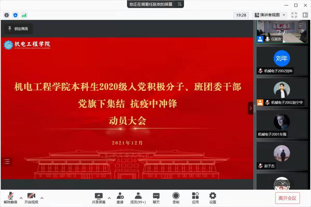 当前疫情防控形势复杂严峻,为进一步做好学校疫情防控工作,充分发挥基层党组织战斗堡垒作用和党员先锋模范作用。12月30日晚,机电工程学院召开本科生2020级入党积极分子、班团委干部“党旗下集结,抗疫中冲锋”动员大会。2020级全体入党积极分子及班团委学生干部参加会议,会议由2020级辅导员任延欢主持。
