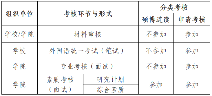 素质考核形式为面试。考核内容包括研究计划(考生通过PPT汇报攻博科研计划书,内容应包括选题背景及意义、国内外研究现状、主要研究内容、技术路线、预期目标等,不超过10分钟)、综合素质(考生思想品德、专业素养、学业水平、科研能力和创新潜质等)两个部分。考核时间原则上不少于20分钟(不含研究计划PPT汇报时间)。