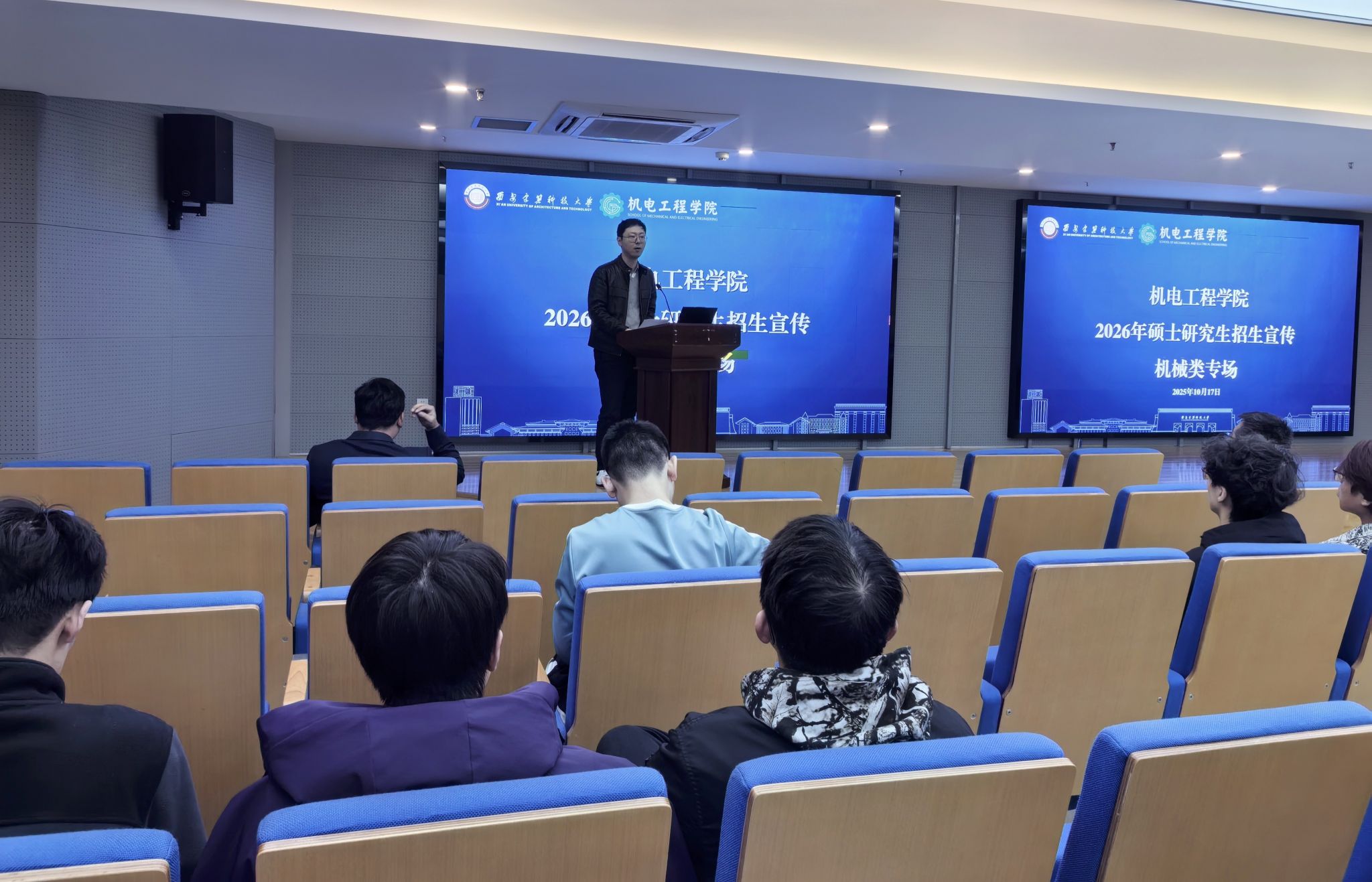 为进一步拓宽研究生生源渠道、提升优质生源吸引力,扎实推进2026年硕士研究生招生宣传和报考服务工作,10月17日,机电工程学院在草堂校区615报告厅和514会议室开展两场2026年硕士研究生招生宣传暨报考指导会。会议由学院院长助理贺宁主持。