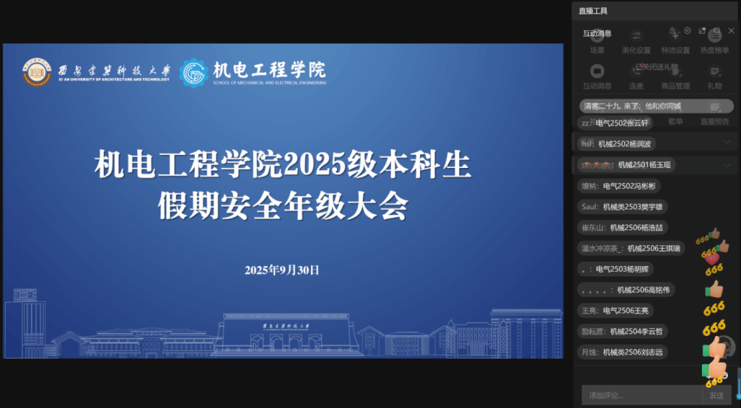 为做好新生安全与健康教育,9月22日晚19:00至21:00,机电工程学院组织全体2025级本科生在学府城参加安全及健康教育现场宣讲与网络直播活动。活动聚焦诈骗真实案例解析、交通安全、消防安全及重点传染病防控等内容,帮助学生认清各类风险隐患,掌握识别诈骗、规避交通危险、应对火灾及预防传染病的实用技能,有效提升了学生自我保护与健康管理能力。活动推动安全健康理念深入人心,学院也将持续推进新生入学教育,引导学生养成良好习惯,为其长远发展筑牢安全健康根基。